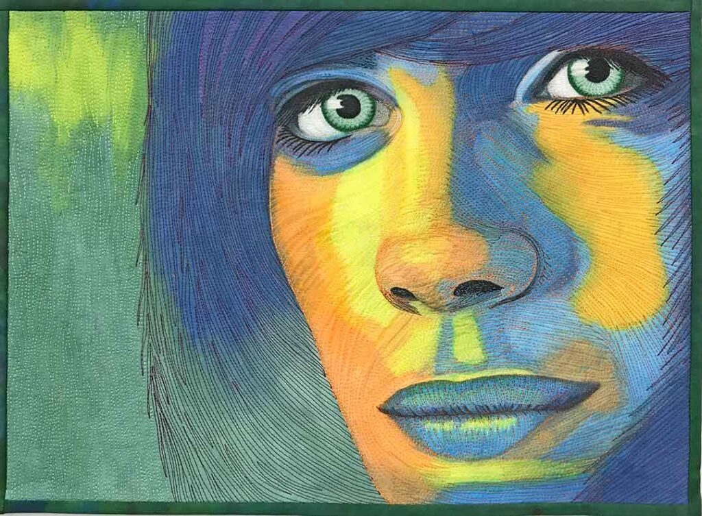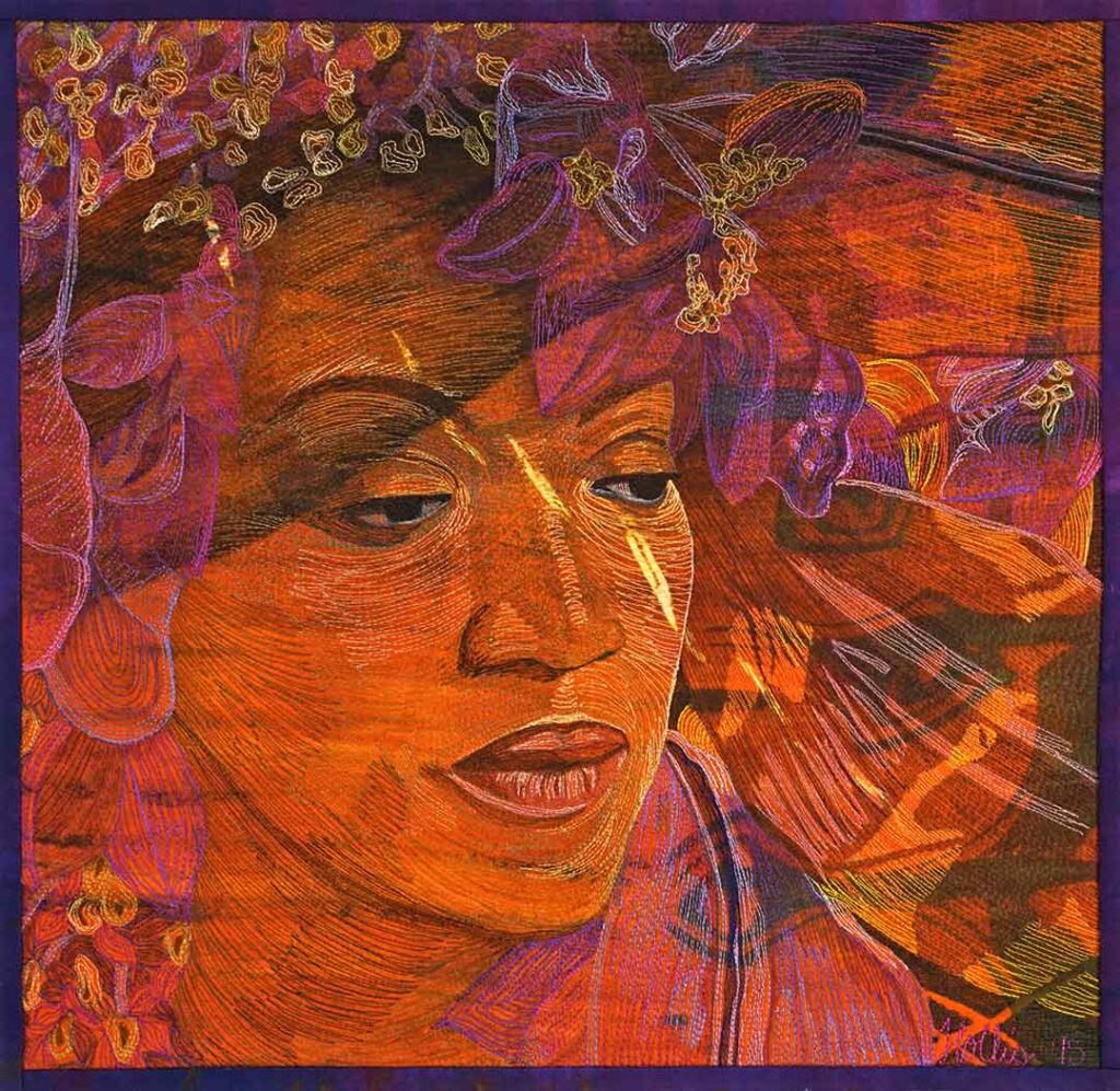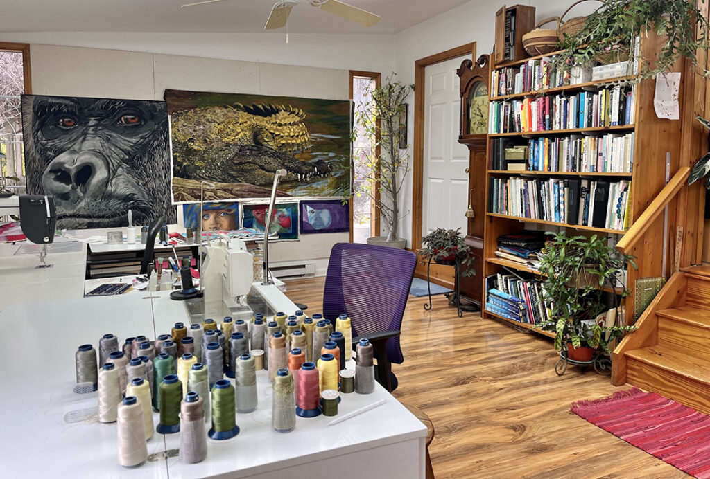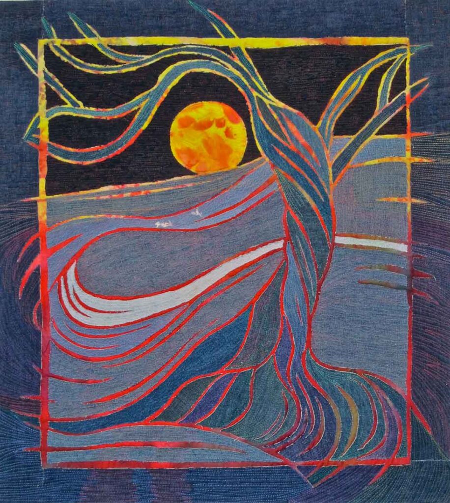I work in textiles, creating textile paintings that are quilted with hundreds of colored threads. My love for textiles started when I lived in Africa for 12 years, where I collected the beautiful African fabrics. This eventually led to teaching myself to sew and quilt, and then creating a technique to paint with thickened dyes. I’ve taught drawing since the 1980s and was a professional photographer for ten years, so I combined my photography, drawing, painting, and quilting to make my own unique art.