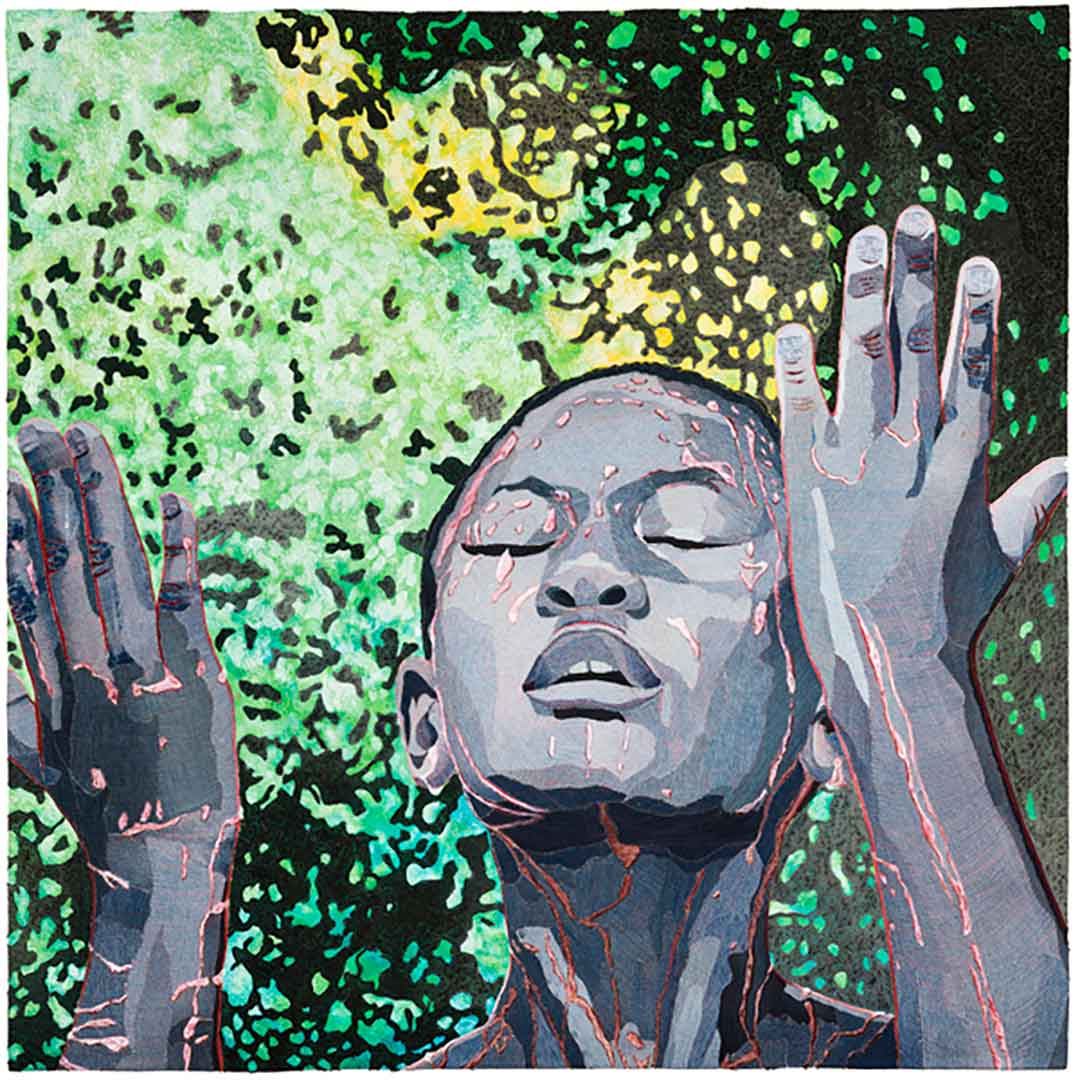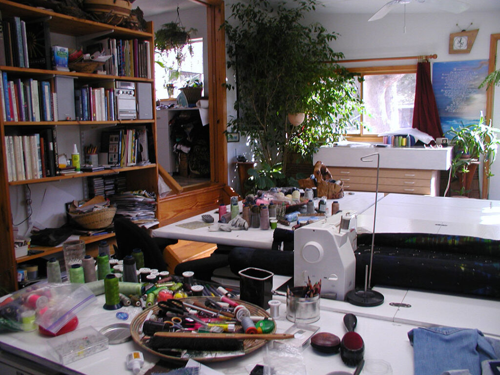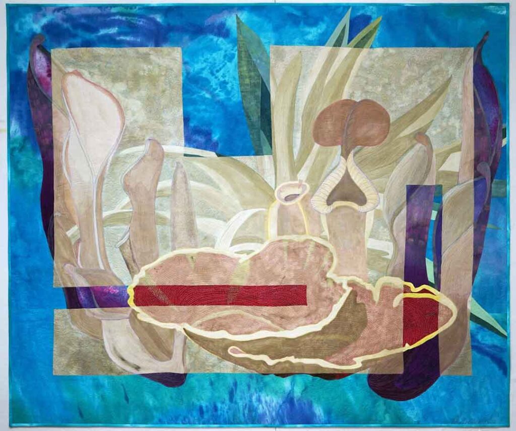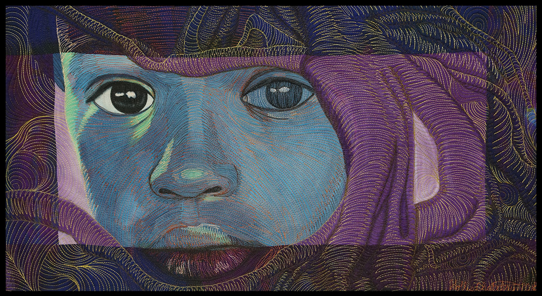 I work in textiles, creating textile paintings that are quilted with hundreds of colored threads. My love for textiles started when I lived in Africa for 12 years, where I collected the beautiful African fabrics. This eventually led to teaching myself to sew and quilt, and then creating a technique to paint with thickened dyes. I’ve taught drawing since the 1980s and was a professional photographer for ten years, so I combined my photography, drawing, painting, and quilting to make my own unique art.