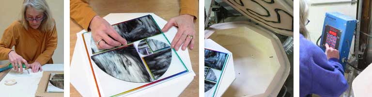 To give you an idea of how glass behaves as a kiln ramps up the temp, here is a short description of what happens at different stages, based on how I usually approach creating a piece of glass art. But before I can get into the fusing process, I need to prepare the design for my piece. After drawing intricate patterns on tracing paper, I cut out different colored glass pieces using a glass cutter, a bandsaw or ring saw for more intricate curves. These saws are covered with small diamond bits which grind their way through the tough edges of glass. Then, onto a properly prepared kiln shelf, I assemble the pieces on to a large bottom piece cut out to the intended full size. Next, I program the kiln to go through a series of stages, commonly referred to as ramps. There are three different numbers to specify. One, the rate — or how fast I want the temperature to rise (how many degrees per hour). Two, the temp I want the kiln to reach. And three, the hold — or how long I want the controller to keep the kiln at that temp. Each kiln has its own idiosyncrasies and there is much trial and error before you obtain the desired results. For the first ramp, I program the controller so that the temp moves up at a rate of 300 degrees/hour from room temp to 1000 degrees. Glass is subject to thermal shock as the temperature increases, so I am very conservative with the rates I use during this ramp, particularly as it moves through a strain point of about 920 degrees. I soak the glass (maintain a constant temperature) at 1000 degrees for a short while so the glass will not get stress. For my second ramp, I program the computer to increase the heat 400 degrees/hour, move up to a temp of 1250 and then hold for 30 minutes. This soak helps the glass to “settle down” and also squeeze out any bubbles that might get trapped beneath the surface. For my third ramp I program a rate of 600/hour and move up to about 1500 degrees. If you were to look inside the kiln you would see that as the temp reaches between 1250 and 1350 degrees the surface of the glass starts to smooth out, and any abrasions on the surface disappear. If the temp is held too long undesirable crystals will begin to grow. Between 1400 and 1500 degrees glass becomes a molten flow and when it later settles itself back into a solid it is completely smooth. For my fourth ramp I program the kiln to go as fast as it can from 1500 degrees back down to 1000 degrees, which I hold for 30 minutes so the glass can properly anneal. I use only Bullseye glass, but because I mix iridescent, transparent, opaque and other speciality glass I place a hold at a temp higher than what others usually do (at around 960 degrees). After this, I let the kiln slowly lose temp at 150 degrees/hour all the way down to a safe 700 degrees. From when the glass was initially placed into the kiln, it might be 12 or 14 hours until the glass slowly moves back down to a temp that is cool enough for you to reach in and remove the glass from the kiln. In some cases, I do not take the glass up to the full fuse point, but stop short, somewhere around 1400, so that the individual pieces of glass — placed on top of other glass — stick together while retaining their particular shape. This is referred to as a Tack Fuse. Artists frequently intentionally use a Tack Fuse so that pieces have dimensionality on the surface.